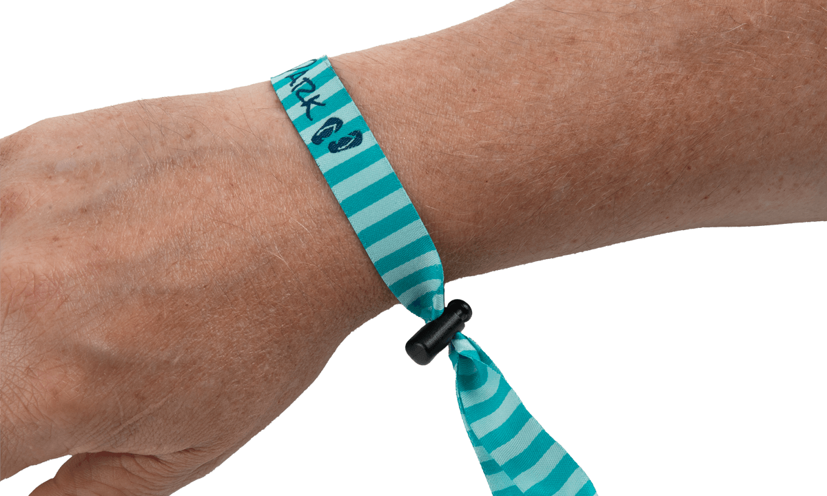 Pulseras de tela bordada reutilizablesLas pulseras de tela "Venice" tienen un cierre de plástico deslizante reutilizable. Gracias a este cierre, estas pulseras se pueden quitar y utilizar muchas veces.